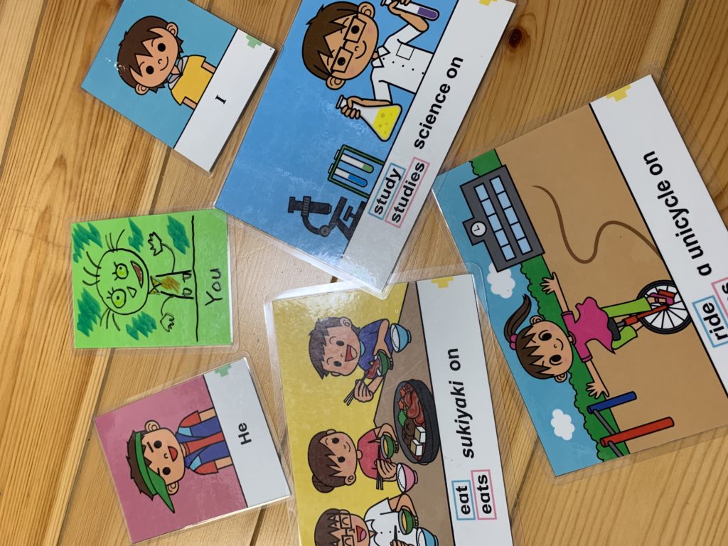 今週から通常レッスン開始。夏休み気分をムリヤリリセット。学校も始まり、いつもの生活が始まりました。今週は、子どもたちにとにかく集中力がないっ(^^)なので、いつものテキストはやらず、質疑応答のルーティーンの後は、絵カードを使って一般動詞の使い方と三人称になった時の変化の仕方のレッスン。て聞くとええっ!?って思うけど、子どもたちにしてみれば、絵カード遊び気分。来週こそ、テキストやります!